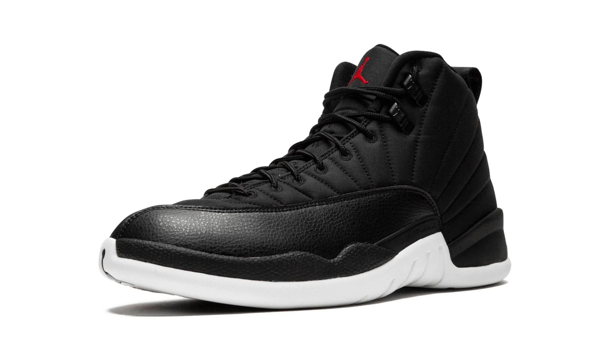 This Air Jordan 12 was recently outfitted in new materials, highlighted by its waterproof nylon coating along the upper. A black leather toe cap fills the remainder of the base, all resting atop a white midsole.
